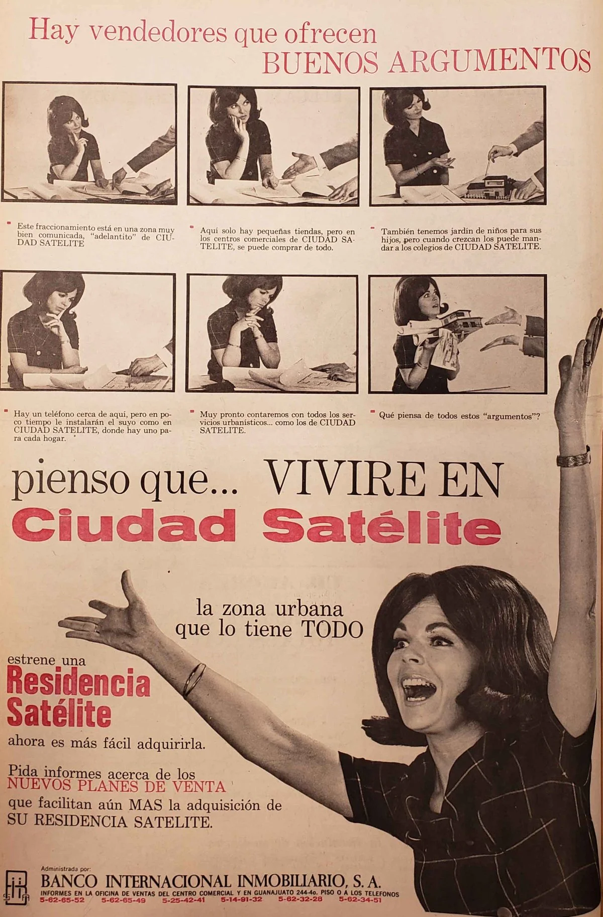 Ciudad Satélite se afirmó como un proyecto emblemático de la modernidad, pero ¿cómo conseguir a los nuevos ciudadanos que la habitaran? Al igual que un proyecto moderno, resultó ser un proyecto principalmente inmobiliario que promocionó un modelo de vida todavía nuevo para el México de la época. El Banco Internacional Inmobiliario se encargó de poner a la venta los terrenos,1 teniendo como target la clase media, pensando que esta capa de la sociedad estaría dispuesta a vivir en las afueras de la ciudad para conseguir una casa propia a precio accesible. Algunas de las razones que comenzaron a configurar la estima por su lugar de habitación fue la economía familiar y patrimonial: los terrenos eran más amplios y baratos que en el Distrito Federal.2 Para la época, los promotores de Ciudad Satélite prometieron servicios que no se solían encontrar fácilmente: hasta la década de los treinta no era común que las colonias que surgían y que ponían a la venta lotes tuvieran servicios como drenaje y agua corriente,3 lo cual se volvió un argumento esencial para la venta de terrenos. ”No busque en otra parte, Ciudad Satélite ya lo tiene todo, agua, luz, teléfono, servicios existentes y verdaderos; pavimentos de concreto, banquetas, drenaje, todo terminado con las mejores calidades. Alumbrado público, limpieza, todo funcionando, no en proyectos.”4